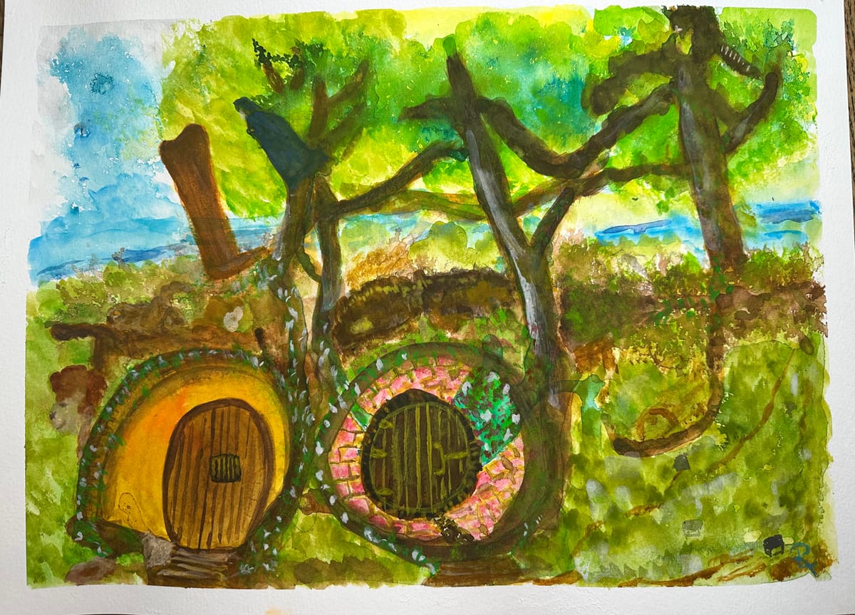 At first glance, this painting feels like a peaceful retreat—two hobbit-like homes nestled under the embrace of ancient, winding trees. The landscape is lush, alive with rich greens, earthy browns, and a sky that stretches infinitely. Yet, as the eye lingers, the veil begins to thin, revealing that this is no ordinary countryside.