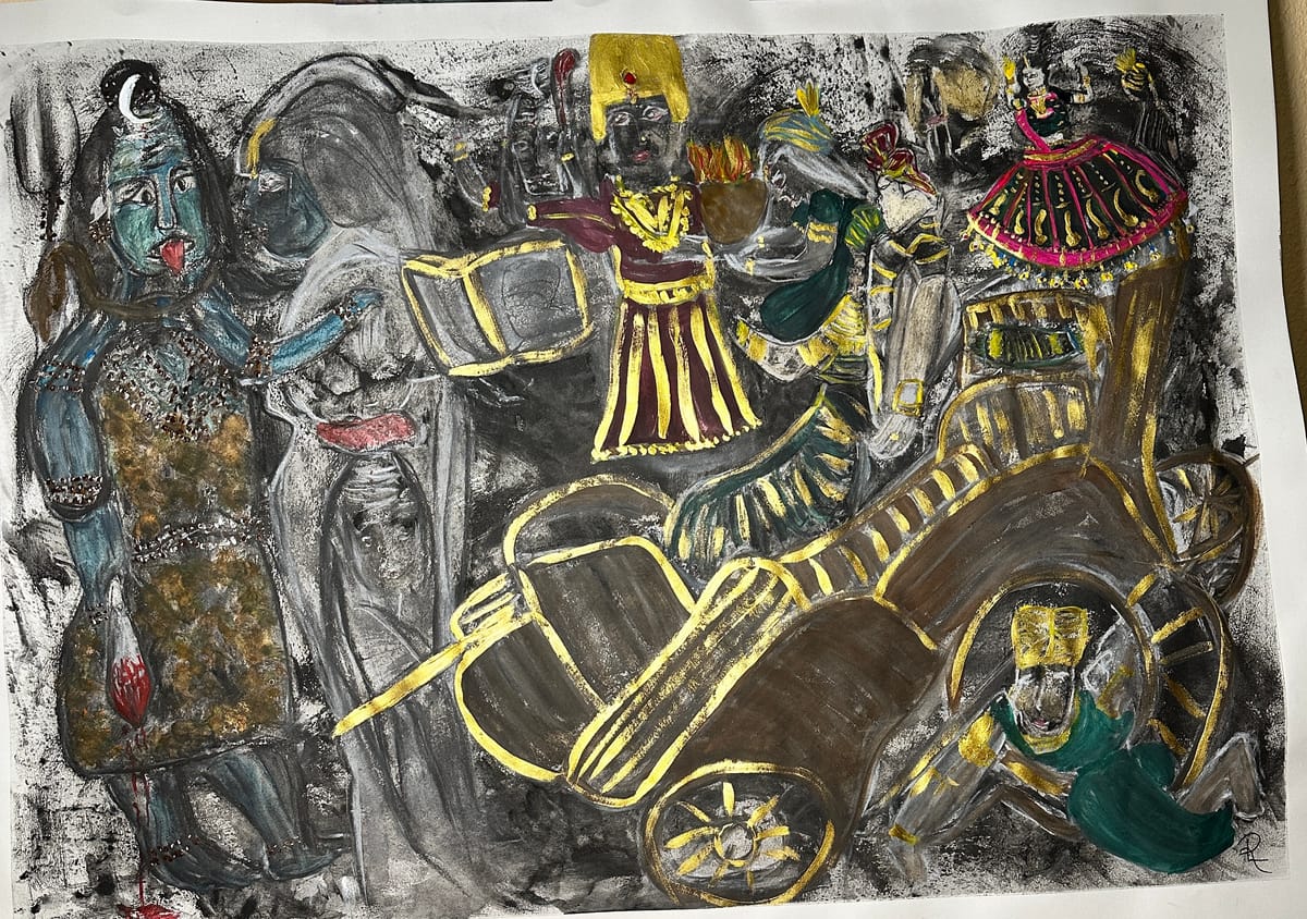 Below, the golden chariot rages forward, its driver standing firm, while beneath its crushing wheels, a man in green is caught, tangled in fate, struggling between resistance and surrender. Divine law moves forward, unstoppable. Below the severed head of Rudra, another face of Shiva appears, crowned with a golden trident, a mirror to the silver trident wielded by Rudra. The two forms of Shiva—destroyer and protector—coexist, intertwined in the cycle of dharma.