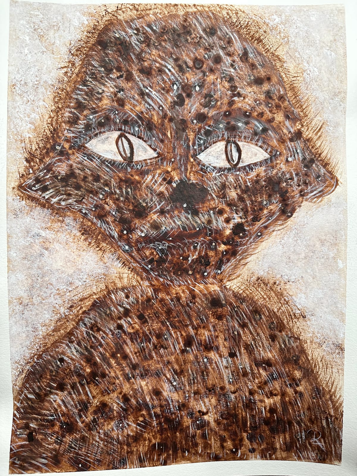 There is an innocence here—an eagerness, as if it has just stepped out from the great cosmic nursery, its first day in the vast, intricate school of creation. The soft, earthly hues of cocoa pigment ground it in warmth, a reminder that even the most otherworldly beings are woven into the fabric of life itself.
